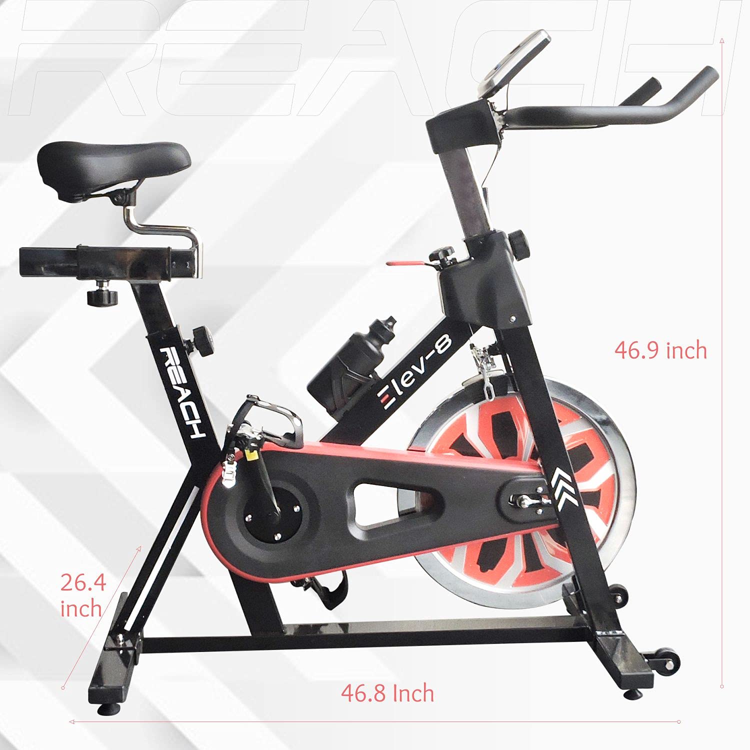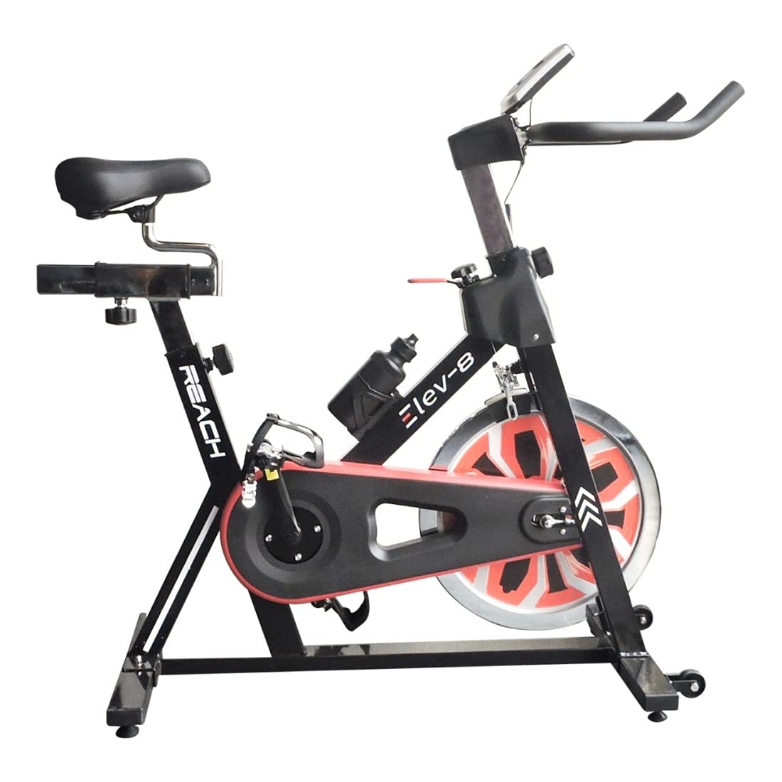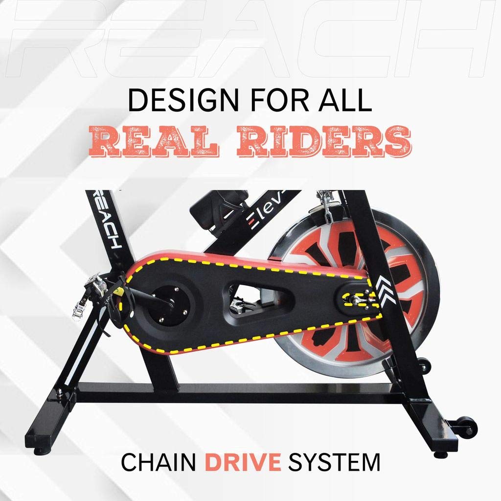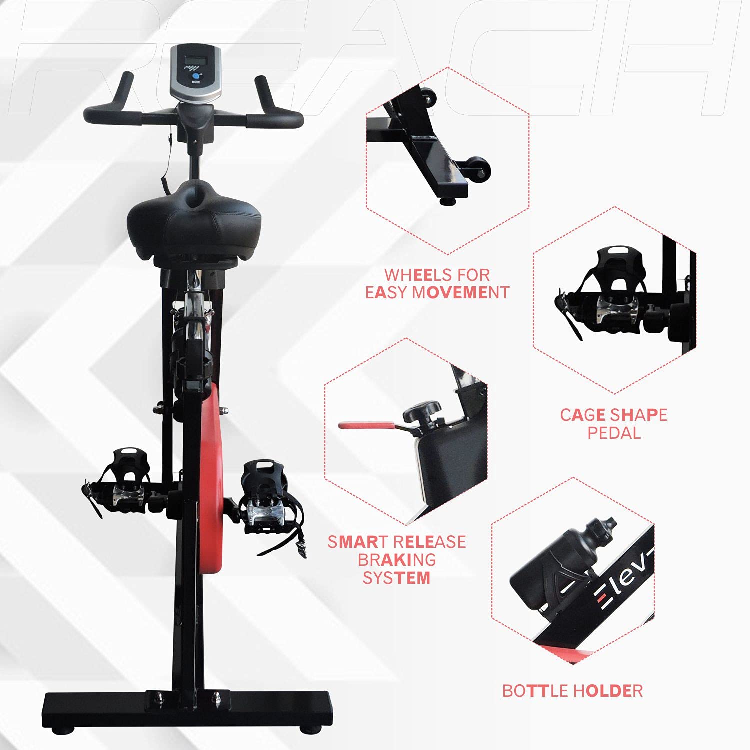 Reach Elev-8 Spin Bike for Home Gym Exercise Cycle with Ajustable Seat and Handle | Best at Home Gym Equipment for Fitness Training Wool Felt Resistance [18 kg Flywheel] 18 KG FLYWHEEL & CHAIN DRIVE MECHANIC - Chain-driven freewheel provides complete control of accelerations and allows for coasting to recover. The design allows the Elev-8 to feel and perform like a high-performance outdoor cycle with 18kg flywheel. Elev-8 is perfect Spin Bike for a home gym. FEATURES - Wool Felt Resistance, Quick Breaking System, 18 Kg Fly Wheel, 8 Level of Magnetic Resistance, CageShape Pedals with adjustable Strap, Easy to move Wheels, 4 Way adjustable Seat, Handle Height Adjustment, Bottle Holder, Ergonomic Seat. WOOL FELT RESISTANCE & SMART RELEASE BRAKING SYSTEM - The precision-balanced flywheel combined with the Wool Felt mechanism allows for smooth and quiet workouts while the built-in pushdown emergency brake will bring the bike to an immediate stop. ULTRA-FUNCTIONAL CONSOLE - The Reach Elev-8 Spinning Home Exercise Bike has a state-of-the-art LCD screen that acts displays time, speed, distance, and calories burned in extra-large numbers for great readability.